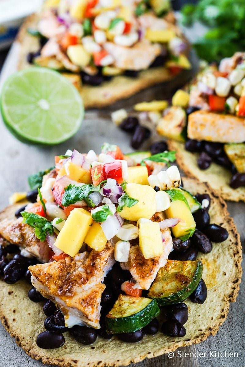 Blackened Salmon Tostadas with Mango Corn Salsa are a healthy dinner that comes together in under 20 minutes with under 350 calories.